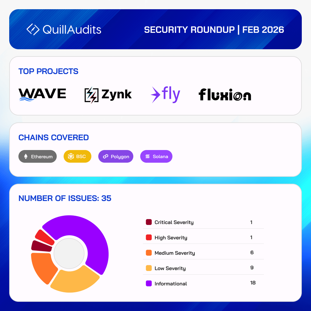 In this February edition of Quill Sentinel, we expanded our research across Layer 2 security models, intent-based DeFi architectures, zk-proof misconfigurations, and AI-assisted auditing frameworks, while also launching our new Security Hub and introducing three major security services: Formal Verification & Fuzzing, On-Chain Monitoring, and QuillAudits Verified.