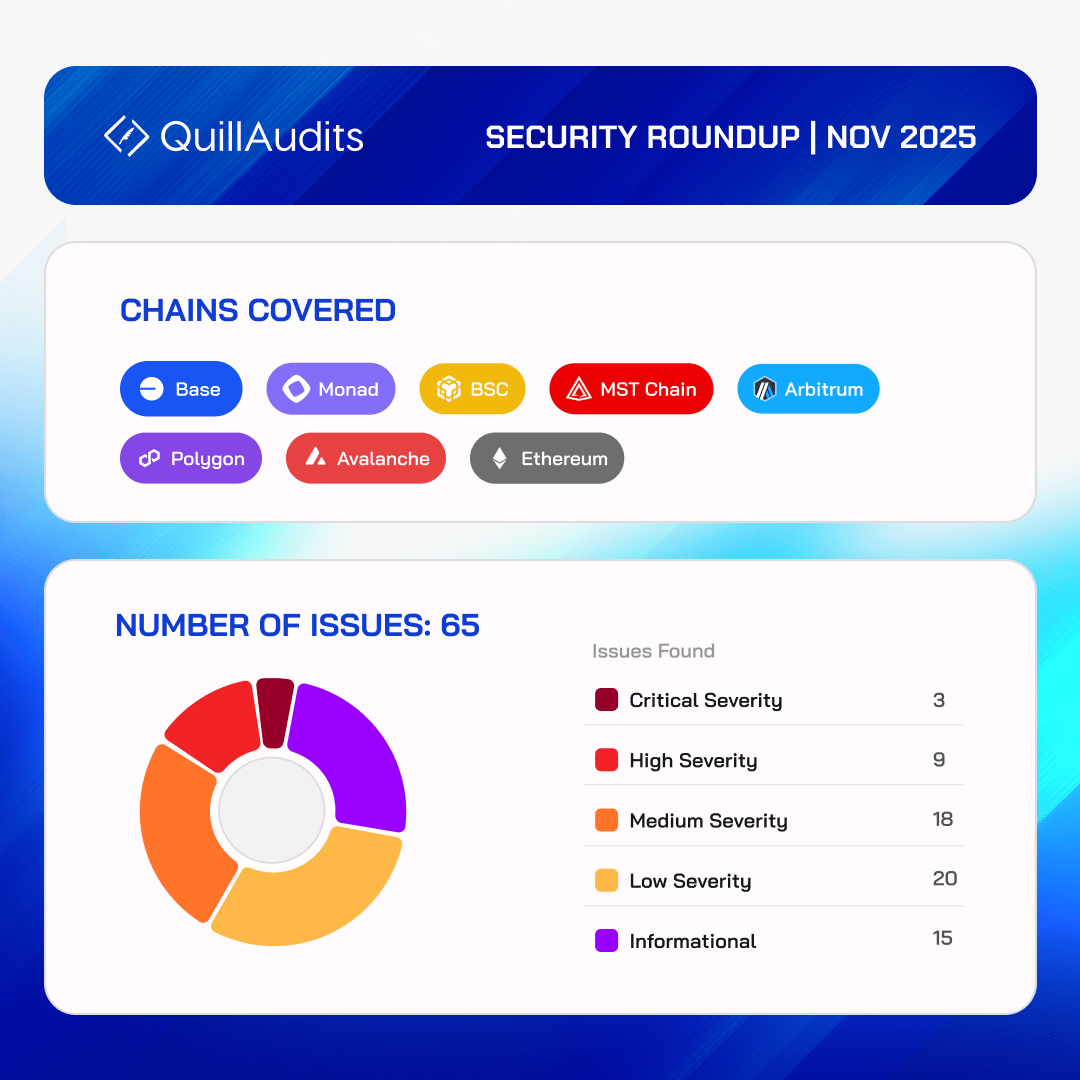 In this November edition of Quill Sentinel, we uncovered 65 vulnerabilities across eight major chains, analyzed a key DeFi exploit, launched the Real-World Assets Handbook, and expanded collaborations aimed at strengthening the global security ecosystem.